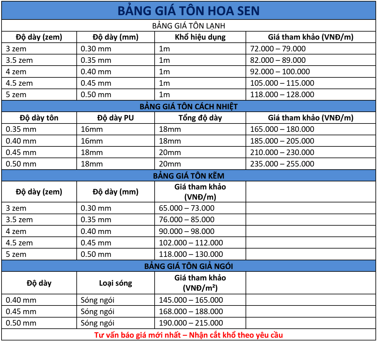 - Giá tôn lạnh Hoa Sen dao động từ 85.000 đ đến 158.000 đ (loại tôn hợp kim nhôm kẽm)